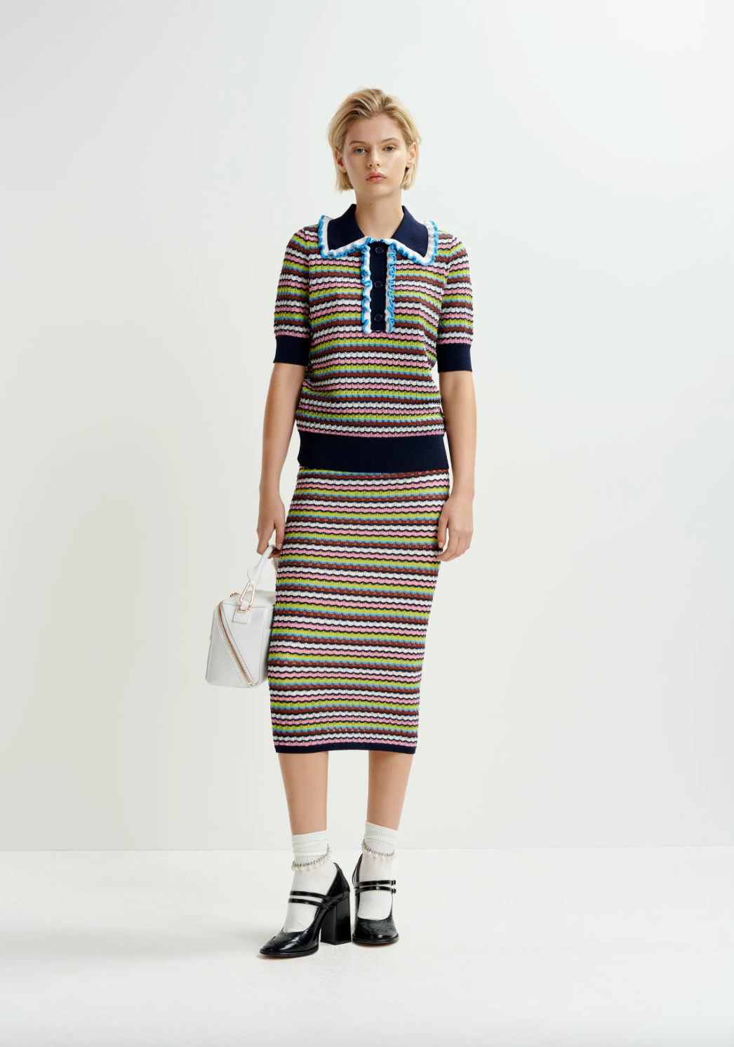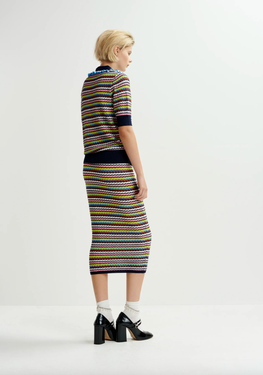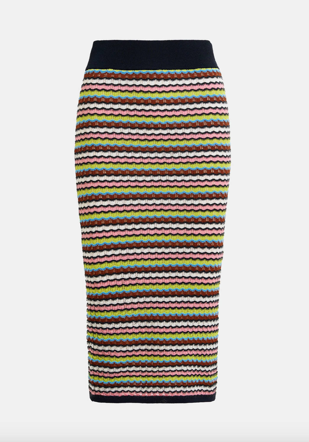 Jupe mi-longue à rayures qui présente une coupe près du corps qui met en valeur votre silhouette, avec une taille élastique pour une tenue confortable tout au long de la journée. Sa coupe polyvalente en fait un basique polyvalent, à porter avec des hauts décontractés ou des chemisiers plus habillés.