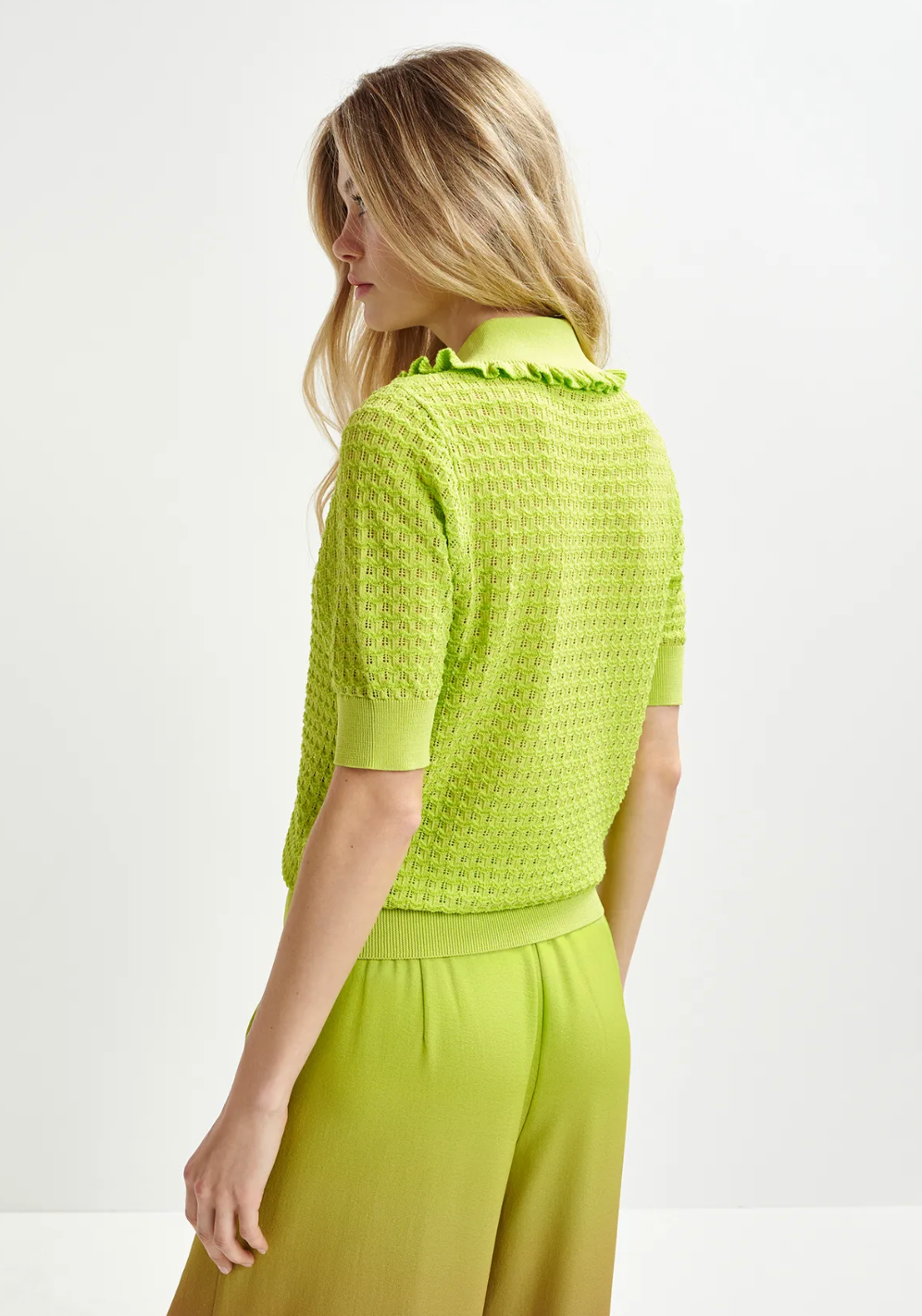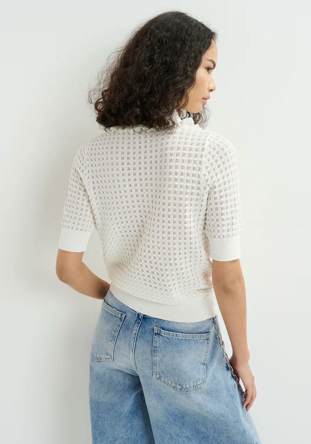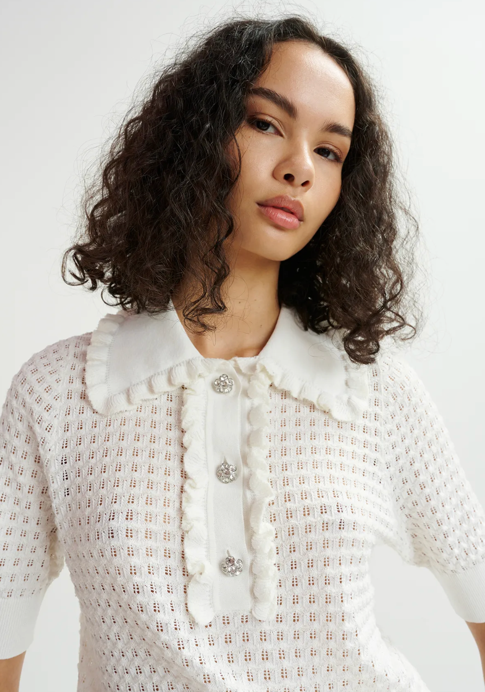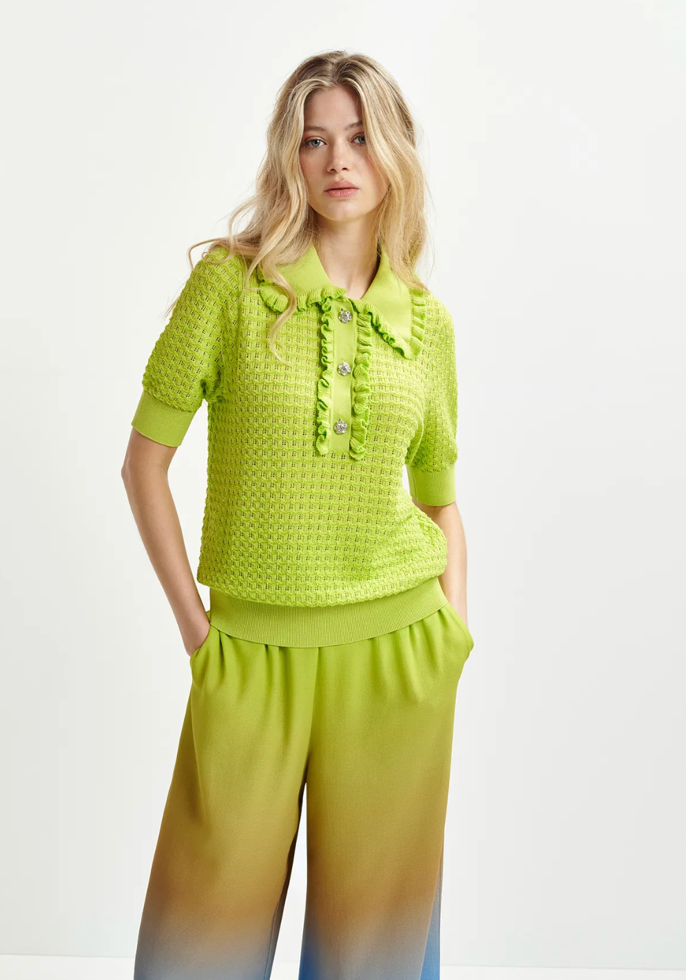 Polo dont la coupe décontractée se resserre au niveau des hanches pour s'associer à merveille à des tailles hautes. Le col rehaussé de volants lui donne un air élégant, tandis que les boutons en strass lui apportent une touche d'éclat.
