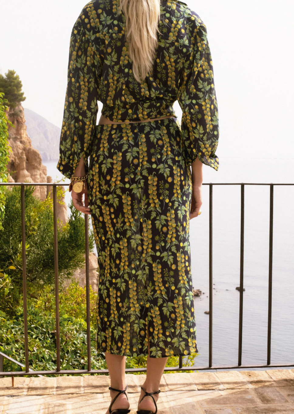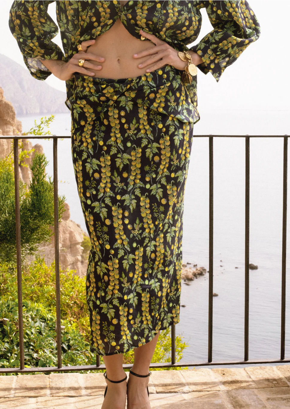 La jupe Raffaelo, avec son imprimé de petites tomates jaunes sur fond bleu marine, a un design très joyeux. Elle est fabriquée en 100 % coton, un tissu léger, doux et respirant qui assure un confort tout au long de la journée. De plus, le coton est très résistant et facile à entretenir. Cette jupe sera donc non seulement l'une de vos préférées pour son design, mais aussi pour son côté pratique.
