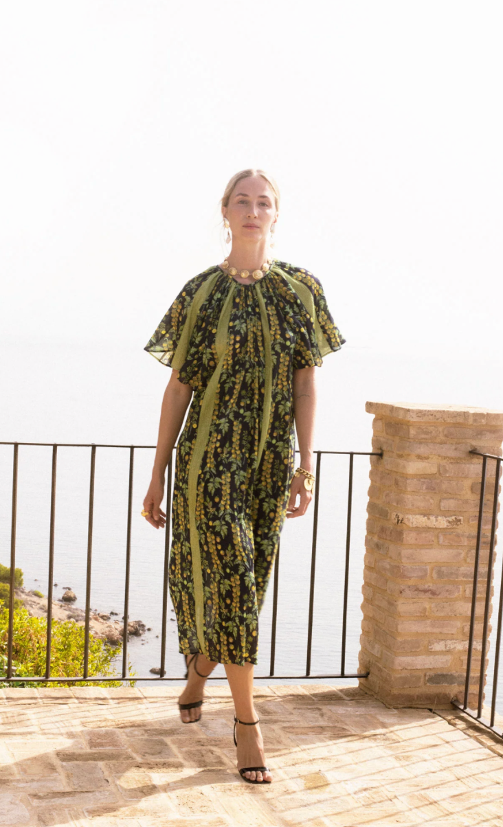 La robe Raffaelo est spectaculaire. L'impression de tomates jaunes sur le fond marine profond. C'est le genre de vêtement qui attire l'attention.