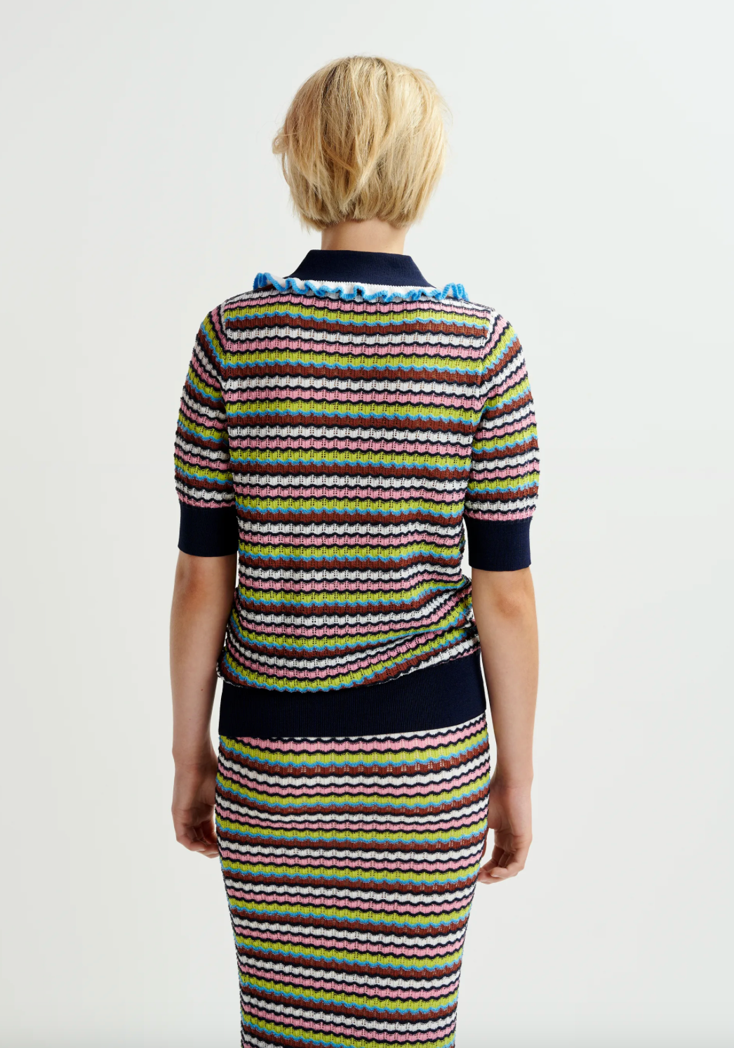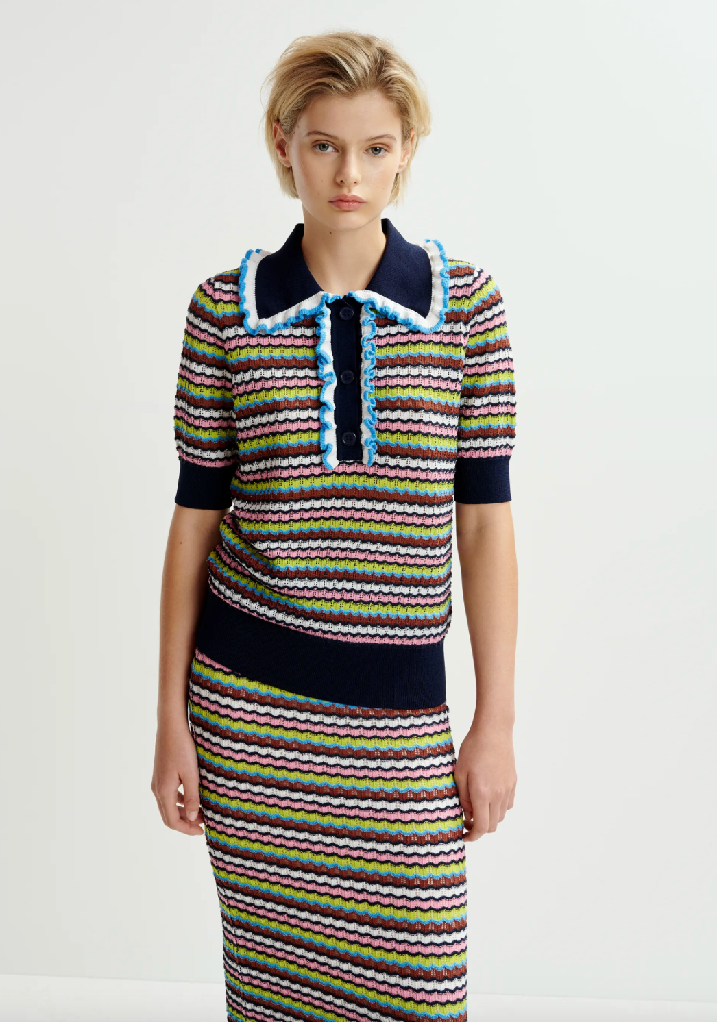 Polo dont la coupe décontractée se resserre au niveau des hanches pour s'associer à merveille à des tailles hautes. Le col rehaussé de volants lui donne un air élégant, tandis que le motif à rayures et les bords contrastés attirent les regards.