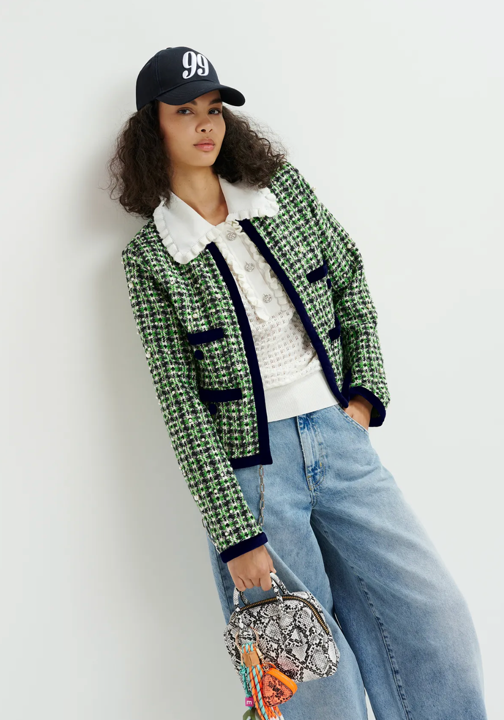 Pièce forte indémodable, cette veste est réalisée à partir d'un tweed tactile dans une coupe oversize agrémentée de détails en velours. Elle présente une encolure sans col, quatre poches plaquées et des ornements de perles pour une finition sophistiquée.